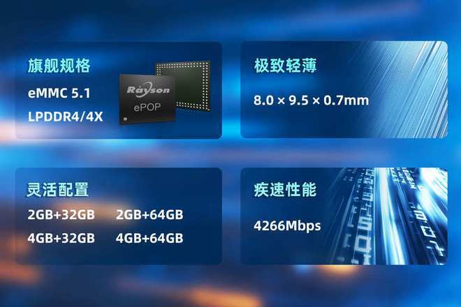 ePOP 存储芯片采用先进的 POP(Package on Package,层叠式封装)技术,整体尺寸仅8.0 mm × 9.5 mm,厚度最薄可达0.7 mm,相比传统分立式存储方案大幅缩小。这样“指甲盖般”的微小体积,不仅精准契合智能穿戴设备对内部空间的极致要求,也为终端厂商在外观设计与结构堆叠上释放更多可能。